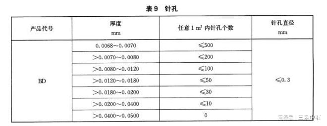 针孔是影响铝箔质量的重要缺陷,可能导致气体或液体渗漏,降低包装的密封性。YS/T 852-2021标准通过表9规定了不同厚度铝箔的针孔个数和直径要求,具体如下: