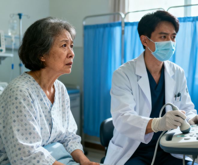 B超检查时,超声医生在屏幕上仔细观察着什么,时而调整探头的位置,时而放大某个区域。陈慧兰躺在检查床上,紧张地看着医生的表情,但什么也看不出来。